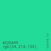 Цвет #22DA99 в цветовой модели RGB обозначается тремя октетами (34, 218, 153) в десятичном формате и #22DA99 в шестнадцатиричном (hex) формате, которые являются интенсивностью красного 34 (hex 22), интенсивность зелёного 218 (hex DA) и интенсивность синего 153 (hex 99).