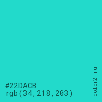 Цвет #22DACB в цветовой модели RGB обозначается тремя октетами (34, 218, 203) в десятичном формате и #22DACB в шестнадцатиричном (hex) формате, которые являются интенсивностью красного 34 (hex 22), интенсивность зелёного 218 (hex DA) и интенсивность синего 203 (hex CB).