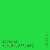 Цвет #22DC42 в цветовой модели RGB обозначается тремя октетами (34, 220, 66) в десятичном формате и #22DC42 в шестнадцатиричном (hex) формате, которые являются интенсивностью красного 34 (hex 22), интенсивность зелёного 220 (hex DC) и интенсивность синего 66 (hex 42).