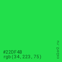 Цвет #22DF4B в цветовой модели RGB обозначается тремя октетами (34, 223, 75) в десятичном формате и #22DF4B в шестнадцатиричном (hex) формате, которые являются интенсивностью красного 34 (hex 22), интенсивность зелёного 223 (hex DF) и интенсивность синего 75 (hex 4B).