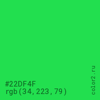 Цвет #22DF4F в цветовой модели RGB обозначается тремя октетами (34, 223, 79) в десятичном формате и #22DF4F в шестнадцатиричном (hex) формате, которые являются интенсивностью красного 34 (hex 22), интенсивность зелёного 223 (hex DF) и интенсивность синего 79 (hex 4F).