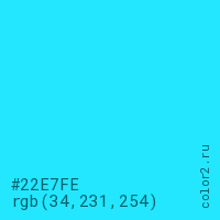 Цвет #22E7FE в цветовой модели RGB обозначается тремя октетами (34, 231, 254) в десятичном формате и #22E7FE в шестнадцатиричном (hex) формате, которые являются интенсивностью красного 34 (hex 22), интенсивность зелёного 231 (hex E7) и интенсивность синего 254 (hex FE).