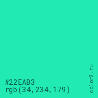 Цвет #22EAB3 в цветовой модели RGB обозначается тремя октетами (34, 234, 179) в десятичном формате и #22EAB3 в шестнадцатиричном (hex) формате, которые являются интенсивностью красного 34 (hex 22), интенсивность зелёного 234 (hex EA) и интенсивность синего 179 (hex B3).