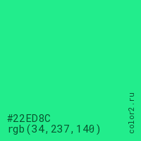 Цвет #22ED8C в цветовой модели RGB обозначается тремя октетами (34, 237, 140) в десятичном формате и #22ED8C в шестнадцатиричном (hex) формате, которые являются интенсивностью красного 34 (hex 22), интенсивность зелёного 237 (hex ED) и интенсивность синего 140 (hex 8C).
