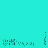 Цвет #22EED5 в цветовой модели RGB обозначается тремя октетами (34, 238, 213) в десятичном формате и #22EED5 в шестнадцатиричном (hex) формате, которые являются интенсивностью красного 34 (hex 22), интенсивность зелёного 238 (hex EE) и интенсивность синего 213 (hex D5).
