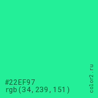 Цвет #22EF97 в цветовой модели RGB обозначается тремя октетами (34, 239, 151) в десятичном формате и #22EF97 в шестнадцатиричном (hex) формате, которые являются интенсивностью красного 34 (hex 22), интенсивность зелёного 239 (hex EF) и интенсивность синего 151 (hex 97).