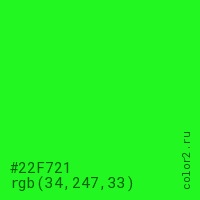 Цвет #22F721 в цветовой модели RGB обозначается тремя октетами (34, 247, 33) в десятичном формате и #22F721 в шестнадцатиричном (hex) формате, которые являются интенсивностью красного 34 (hex 22), интенсивность зелёного 247 (hex F7) и интенсивность синего 33 (hex 21).