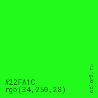 Цвет #22FA1C в цветовой модели RGB обозначается тремя октетами (34, 250, 28) в десятичном формате и #22FA1C в шестнадцатиричном (hex) формате, которые являются интенсивностью красного 34 (hex 22), интенсивность зелёного 250 (hex FA) и интенсивность синего 28 (hex 1C).