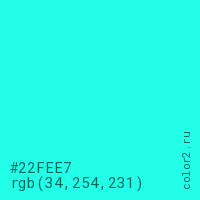 Цвет #22FEE7 в цветовой модели RGB обозначается тремя октетами (34, 254, 231) в десятичном формате и #22FEE7 в шестнадцатиричном (hex) формате, которые являются интенсивностью красного 34 (hex 22), интенсивность зелёного 254 (hex FE) и интенсивность синего 231 (hex E7).