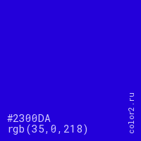 Цвет #2300DA в цветовой модели RGB обозначается тремя октетами (35, 0, 218) в десятичном формате и #2300DA в шестнадцатиричном (hex) формате, которые являются интенсивностью красного 35 (hex 23), интенсивность зелёного 0 (hex 00) и интенсивность синего 218 (hex DA).
