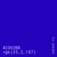 Цвет #2302BB в цветовой модели RGB обозначается тремя октетами (35, 2, 187) в десятичном формате и #2302BB в шестнадцатиричном (hex) формате, которые являются интенсивностью красного 35 (hex 23), интенсивность зелёного 2 (hex 02) и интенсивность синего 187 (hex BB).