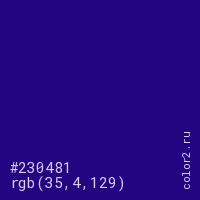 Цвет #230481 в цветовой модели RGB обозначается тремя октетами (35, 4, 129) в десятичном формате и #230481 в шестнадцатиричном (hex) формате, которые являются интенсивностью красного 35 (hex 23), интенсивность зелёного 4 (hex 04) и интенсивность синего 129 (hex 81).