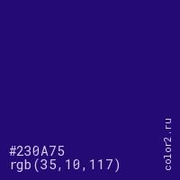 Цвет #230A75 в цветовой модели RGB обозначается тремя октетами (35, 10, 117) в десятичном формате и #230A75 в шестнадцатиричном (hex) формате, которые являются интенсивностью красного 35 (hex 23), интенсивность зелёного 10 (hex 0A) и интенсивность синего 117 (hex 75).
