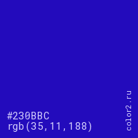 Цвет #230BBC в цветовой модели RGB обозначается тремя октетами (35, 11, 188) в десятичном формате и #230BBC в шестнадцатиричном (hex) формате, которые являются интенсивностью красного 35 (hex 23), интенсивность зелёного 11 (hex 0B) и интенсивность синего 188 (hex BC).