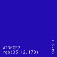 Цвет #230CB2 в цветовой модели RGB обозначается тремя октетами (35, 12, 178) в десятичном формате и #230CB2 в шестнадцатиричном (hex) формате, которые являются интенсивностью красного 35 (hex 23), интенсивность зелёного 12 (hex 0C) и интенсивность синего 178 (hex B2).
