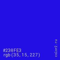 Цвет #230FE3 в цветовой модели RGB обозначается тремя октетами (35, 15, 227) в десятичном формате и #230FE3 в шестнадцатиричном (hex) формате, которые являются интенсивностью красного 35 (hex 23), интенсивность зелёного 15 (hex 0F) и интенсивность синего 227 (hex E3).
