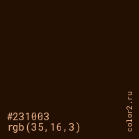 Цвет #231003 в цветовой модели RGB обозначается тремя октетами (35, 16, 3) в десятичном формате и #231003 в шестнадцатиричном (hex) формате, которые являются интенсивностью красного 35 (hex 23), интенсивность зелёного 16 (hex 10) и интенсивность синего 3 (hex 03).