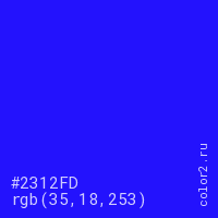 Цвет #2312FD в цветовой модели RGB обозначается тремя октетами (35, 18, 253) в десятичном формате и #2312FD в шестнадцатиричном (hex) формате, которые являются интенсивностью красного 35 (hex 23), интенсивность зелёного 18 (hex 12) и интенсивность синего 253 (hex FD).