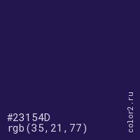 Цвет #23154D в цветовой модели RGB обозначается тремя октетами (35, 21, 77) в десятичном формате и #23154D в шестнадцатиричном (hex) формате, которые являются интенсивностью красного 35 (hex 23), интенсивность зелёного 21 (hex 15) и интенсивность синего 77 (hex 4D).