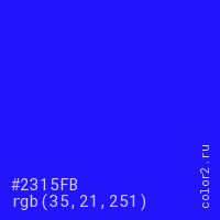 Цвет #2315FB в цветовой модели RGB обозначается тремя октетами (35, 21, 251) в десятичном формате и #2315FB в шестнадцатиричном (hex) формате, которые являются интенсивностью красного 35 (hex 23), интенсивность зелёного 21 (hex 15) и интенсивность синего 251 (hex FB).