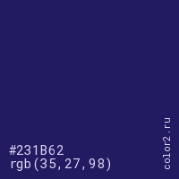 Цвет #231B62 в цветовой модели RGB обозначается тремя октетами (35, 27, 98) в десятичном формате и #231B62 в шестнадцатиричном (hex) формате, которые являются интенсивностью красного 35 (hex 23), интенсивность зелёного 27 (hex 1B) и интенсивность синего 98 (hex 62).