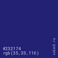 Цвет #232174 в цветовой модели RGB обозначается тремя октетами (35, 33, 116) в десятичном формате и #232174 в шестнадцатиричном (hex) формате, которые являются интенсивностью красного 35 (hex 23), интенсивность зелёного 33 (hex 21) и интенсивность синего 116 (hex 74).