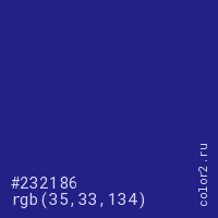 Цвет #232186 в цветовой модели RGB обозначается тремя октетами (35, 33, 134) в десятичном формате и #232186 в шестнадцатиричном (hex) формате, которые являются интенсивностью красного 35 (hex 23), интенсивность зелёного 33 (hex 21) и интенсивность синего 134 (hex 86).