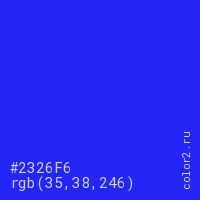 Цвет #2326F6 в цветовой модели RGB обозначается тремя октетами (35, 38, 246) в десятичном формате и #2326F6 в шестнадцатиричном (hex) формате, которые являются интенсивностью красного 35 (hex 23), интенсивность зелёного 38 (hex 26) и интенсивность синего 246 (hex F6).