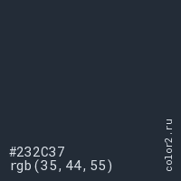 Цвет #232C37 в цветовой модели RGB обозначается тремя октетами (35, 44, 55) в десятичном формате и #232C37 в шестнадцатиричном (hex) формате, которые являются интенсивностью красного 35 (hex 23), интенсивность зелёного 44 (hex 2C) и интенсивность синего 55 (hex 37).
