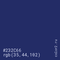 Цвет #232C66 в цветовой модели RGB обозначается тремя октетами (35, 44, 102) в десятичном формате и #232C66 в шестнадцатиричном (hex) формате, которые являются интенсивностью красного 35 (hex 23), интенсивность зелёного 44 (hex 2C) и интенсивность синего 102 (hex 66).