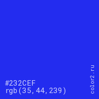 Цвет #232CEF в цветовой модели RGB обозначается тремя октетами (35, 44, 239) в десятичном формате и #232CEF в шестнадцатиричном (hex) формате, которые являются интенсивностью красного 35 (hex 23), интенсивность зелёного 44 (hex 2C) и интенсивность синего 239 (hex EF).