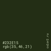 Цвет #232E15 в цветовой модели RGB обозначается тремя октетами (35, 46, 21) в десятичном формате и #232E15 в шестнадцатиричном (hex) формате, которые являются интенсивностью красного 35 (hex 23), интенсивность зелёного 46 (hex 2E) и интенсивность синего 21 (hex 15).