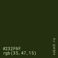 Цвет #232F0F в цветовой модели RGB обозначается тремя октетами (35, 47, 15) в десятичном формате и #232F0F в шестнадцатиричном (hex) формате, которые являются интенсивностью красного 35 (hex 23), интенсивность зелёного 47 (hex 2F) и интенсивность синего 15 (hex 0F).