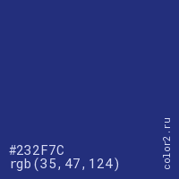 Цвет #232F7C в цветовой модели RGB обозначается тремя октетами (35, 47, 124) в десятичном формате и #232F7C в шестнадцатиричном (hex) формате, которые являются интенсивностью красного 35 (hex 23), интенсивность зелёного 47 (hex 2F) и интенсивность синего 124 (hex 7C).