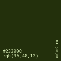 Цвет #23300C в цветовой модели RGB обозначается тремя октетами (35, 48, 12) в десятичном формате и #23300C в шестнадцатиричном (hex) формате, которые являются интенсивностью красного 35 (hex 23), интенсивность зелёного 48 (hex 30) и интенсивность синего 12 (hex 0C).