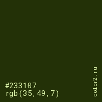 Цвет #233107 в цветовой модели RGB обозначается тремя октетами (35, 49, 7) в десятичном формате и #233107 в шестнадцатиричном (hex) формате, которые являются интенсивностью красного 35 (hex 23), интенсивность зелёного 49 (hex 31) и интенсивность синего 7 (hex 07).