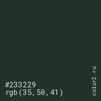 Цвет #233229 в цветовой модели RGB обозначается тремя октетами (35, 50, 41) в десятичном формате и #233229 в шестнадцатиричном (hex) формате, которые являются интенсивностью красного 35 (hex 23), интенсивность зелёного 50 (hex 32) и интенсивность синего 41 (hex 29).