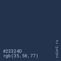 Цвет #23324D в цветовой модели RGB обозначается тремя октетами (35, 50, 77) в десятичном формате и #23324D в шестнадцатиричном (hex) формате, которые являются интенсивностью красного 35 (hex 23), интенсивность зелёного 50 (hex 32) и интенсивность синего 77 (hex 4D).