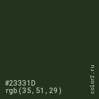 Цвет #23331D в цветовой модели RGB обозначается тремя октетами (35, 51, 29) в десятичном формате и #23331D в шестнадцатиричном (hex) формате, которые являются интенсивностью красного 35 (hex 23), интенсивность зелёного 51 (hex 33) и интенсивность синего 29 (hex 1D).