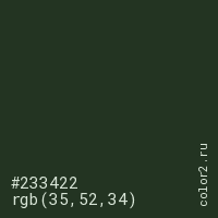 Цвет #233422 в цветовой модели RGB обозначается тремя октетами (35, 52, 34) в десятичном формате и #233422 в шестнадцатиричном (hex) формате, которые являются интенсивностью красного 35 (hex 23), интенсивность зелёного 52 (hex 34) и интенсивность синего 34 (hex 22).