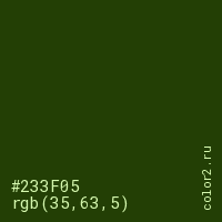 Цвет #233F05 в цветовой модели RGB обозначается тремя октетами (35, 63, 5) в десятичном формате и #233F05 в шестнадцатиричном (hex) формате, которые являются интенсивностью красного 35 (hex 23), интенсивность зелёного 63 (hex 3F) и интенсивность синего 5 (hex 05).