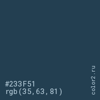 Цвет #233F51 в цветовой модели RGB обозначается тремя октетами (35, 63, 81) в десятичном формате и #233F51 в шестнадцатиричном (hex) формате, которые являются интенсивностью красного 35 (hex 23), интенсивность зелёного 63 (hex 3F) и интенсивность синего 81 (hex 51).