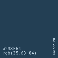 Цвет #233F54 в цветовой модели RGB обозначается тремя октетами (35, 63, 84) в десятичном формате и #233F54 в шестнадцатиричном (hex) формате, которые являются интенсивностью красного 35 (hex 23), интенсивность зелёного 63 (hex 3F) и интенсивность синего 84 (hex 54).