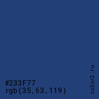 Цвет #233F77 в цветовой модели RGB обозначается тремя октетами (35, 63, 119) в десятичном формате и #233F77 в шестнадцатиричном (hex) формате, которые являются интенсивностью красного 35 (hex 23), интенсивность зелёного 63 (hex 3F) и интенсивность синего 119 (hex 77).