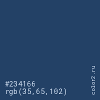 Цвет #234166 в цветовой модели RGB обозначается тремя октетами (35, 65, 102) в десятичном формате и #234166 в шестнадцатиричном (hex) формате, которые являются интенсивностью красного 35 (hex 23), интенсивность зелёного 65 (hex 41) и интенсивность синего 102 (hex 66).