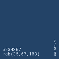 Цвет #234367 в цветовой модели RGB обозначается тремя октетами (35, 67, 103) в десятичном формате и #234367 в шестнадцатиричном (hex) формате, которые являются интенсивностью красного 35 (hex 23), интенсивность зелёного 67 (hex 43) и интенсивность синего 103 (hex 67).