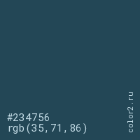 Цвет #234756 в цветовой модели RGB обозначается тремя октетами (35, 71, 86) в десятичном формате и #234756 в шестнадцатиричном (hex) формате, которые являются интенсивностью красного 35 (hex 23), интенсивность зелёного 71 (hex 47) и интенсивность синего 86 (hex 56).