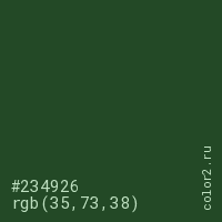Цвет #234926 в цветовой модели RGB обозначается тремя октетами (35, 73, 38) в десятичном формате и #234926 в шестнадцатиричном (hex) формате, которые являются интенсивностью красного 35 (hex 23), интенсивность зелёного 73 (hex 49) и интенсивность синего 38 (hex 26).