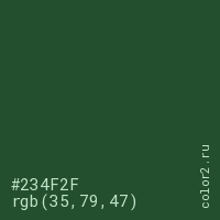 Цвет #234F2F в цветовой модели RGB обозначается тремя октетами (35, 79, 47) в десятичном формате и #234F2F в шестнадцатиричном (hex) формате, которые являются интенсивностью красного 35 (hex 23), интенсивность зелёного 79 (hex 4F) и интенсивность синего 47 (hex 2F).
