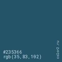 Цвет #235366 в цветовой модели RGB обозначается тремя октетами (35, 83, 102) в десятичном формате и #235366 в шестнадцатиричном (hex) формате, которые являются интенсивностью красного 35 (hex 23), интенсивность зелёного 83 (hex 53) и интенсивность синего 102 (hex 66).